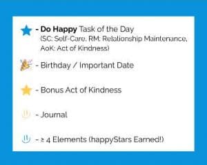 Every week, you can earn up to 120 happyStars for completing all of your Do Happy Tasks of the Day. Earn additional happyStars for journaling, completing bonus acts of kindness, and reaching out to your loved ones on their important dates. Decide for yourself how many happyStars you want to earn each week!