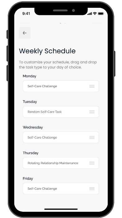 The Do Happy App provides you with a daily task to complete. Over the week, you will receive four self-care tasks, two relationship maintenance tasks, and one random act of kindness. Customize your task schedule to give yourself the best chance of successfully completing the different task types!