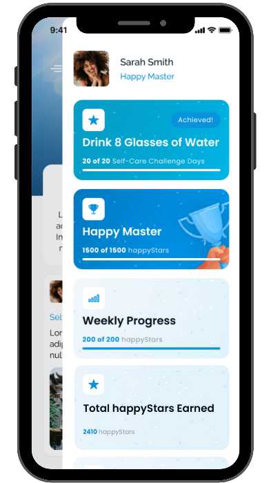 Achieve happy status based on your running total happyStars over eight weeks. You’ll want to stick with it if you want to reach the maximum status of Happy Master by earning (and then maintaining) 1500 happyStars over eight weeks!